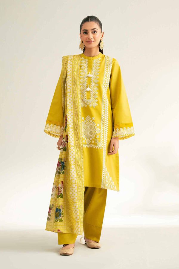 Threads of culture, styled with soul with this digitally printed embroidered three-piece from the latest unstitched Winter Collection. Product Detail:Ethnic Style Shirt with Dupatta & Trousers SHIRTEmbroidered Solid Khaddar Shirt...