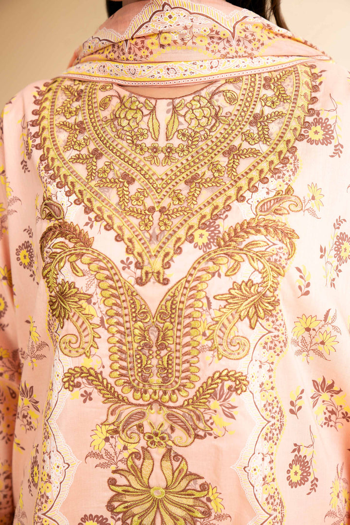 Unveil your signature style with flatbed paste embroidered three-piece from the latest unstitched summer collection.