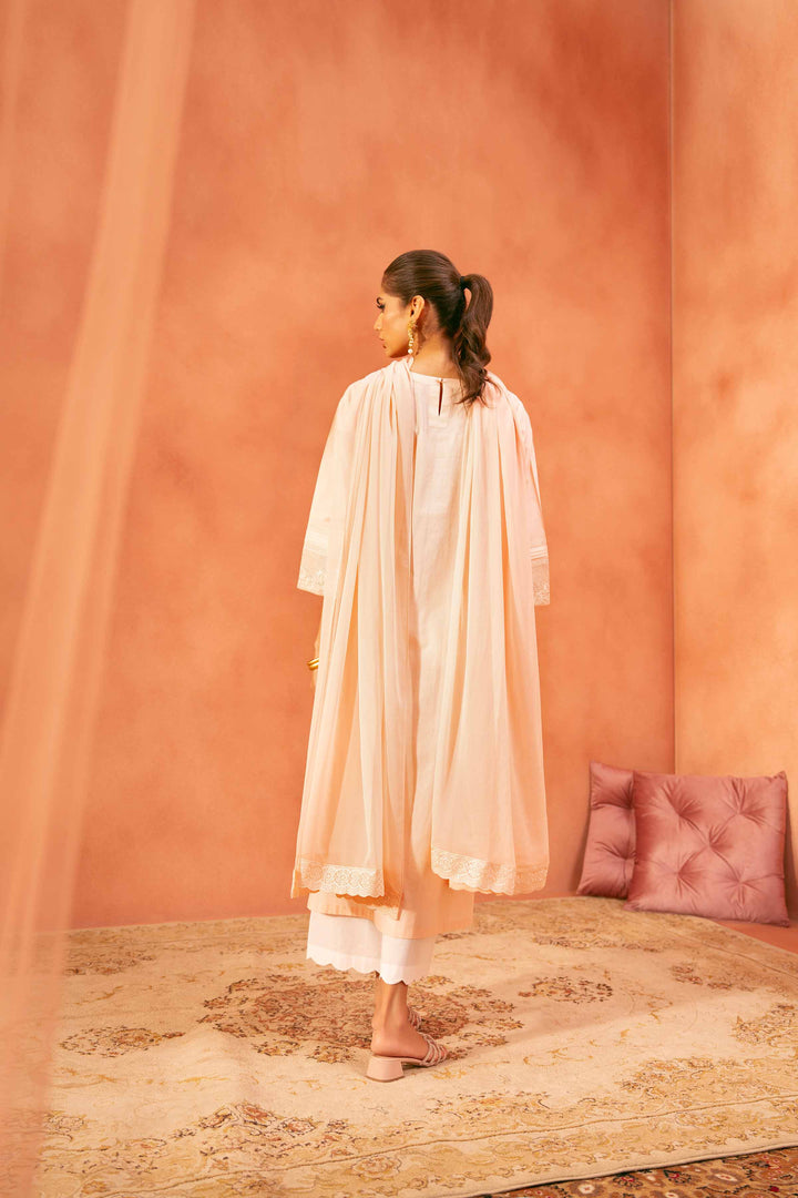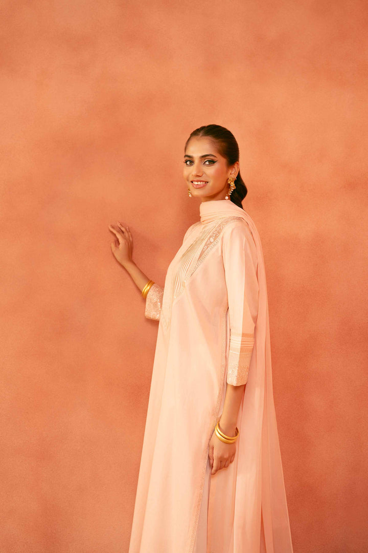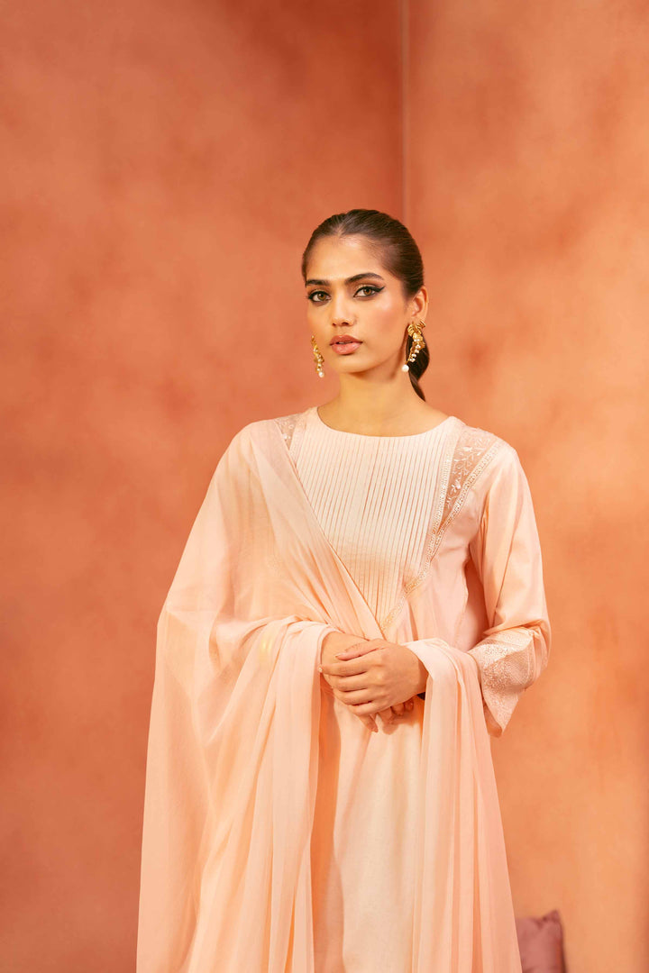 Long embroidered shirt featuring a round neckline with back slit, organza embroidered and pleated fabric inserted at the yoke and extended embroidered organza borders on the sleeves.