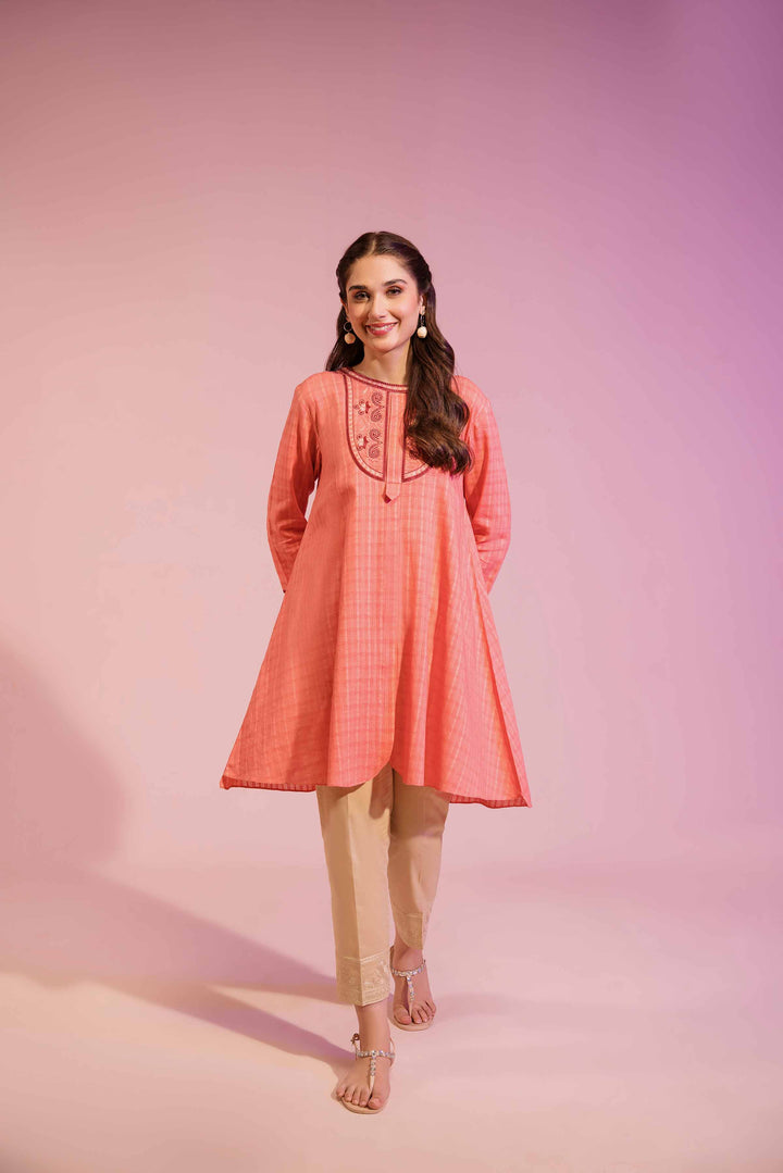 Round Neckline With Placket, Front Open At Hem, Embroidered Neckline & Sleeves