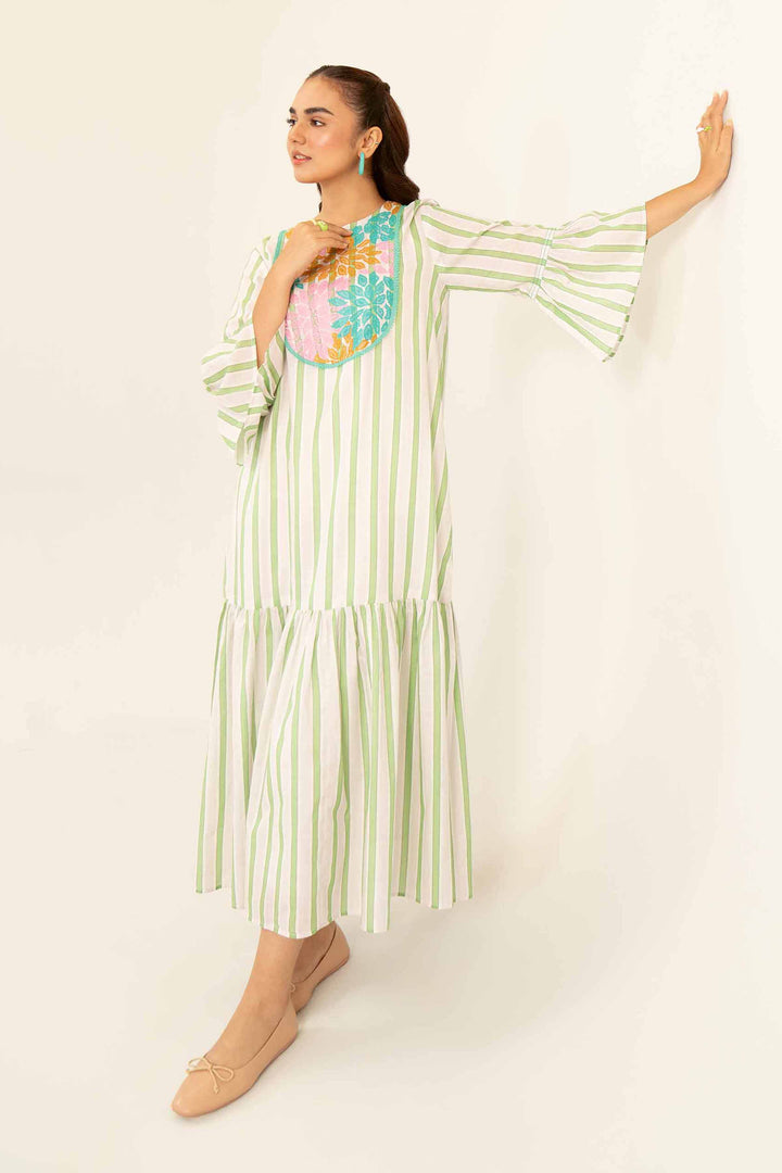 Round Neckline, Gathered Sleeves & Hem, Embroidered Yoke, Long Dress