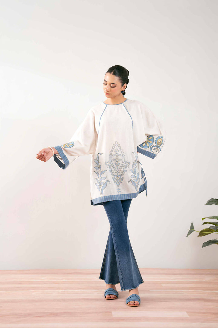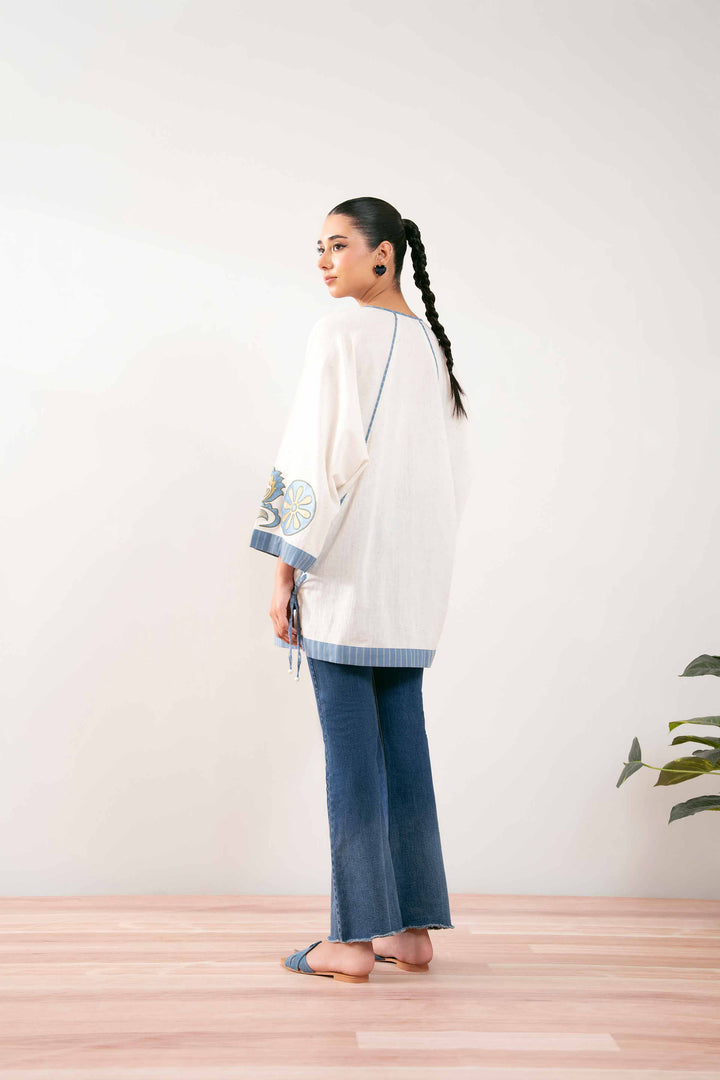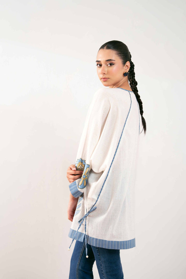 Kimono tunic featuring a round neckline with embroidered front and sleeves, enhanced with all-over piping detail.