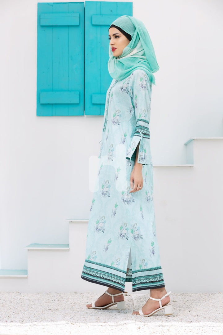 Elegant and refreshing blue colored digital printed stitched lawn Fustaan with round neckline and a V slit; an ideal outfit by Nishat Linen Sawan'18 collection to make you look stylish but modest.