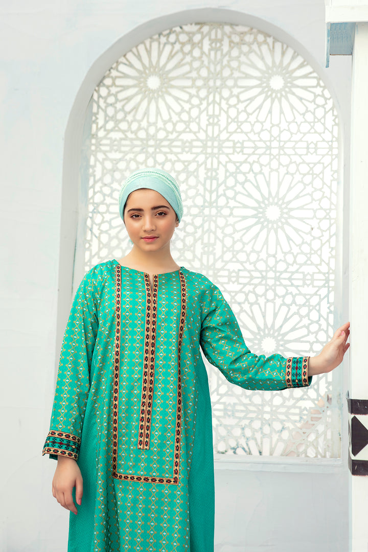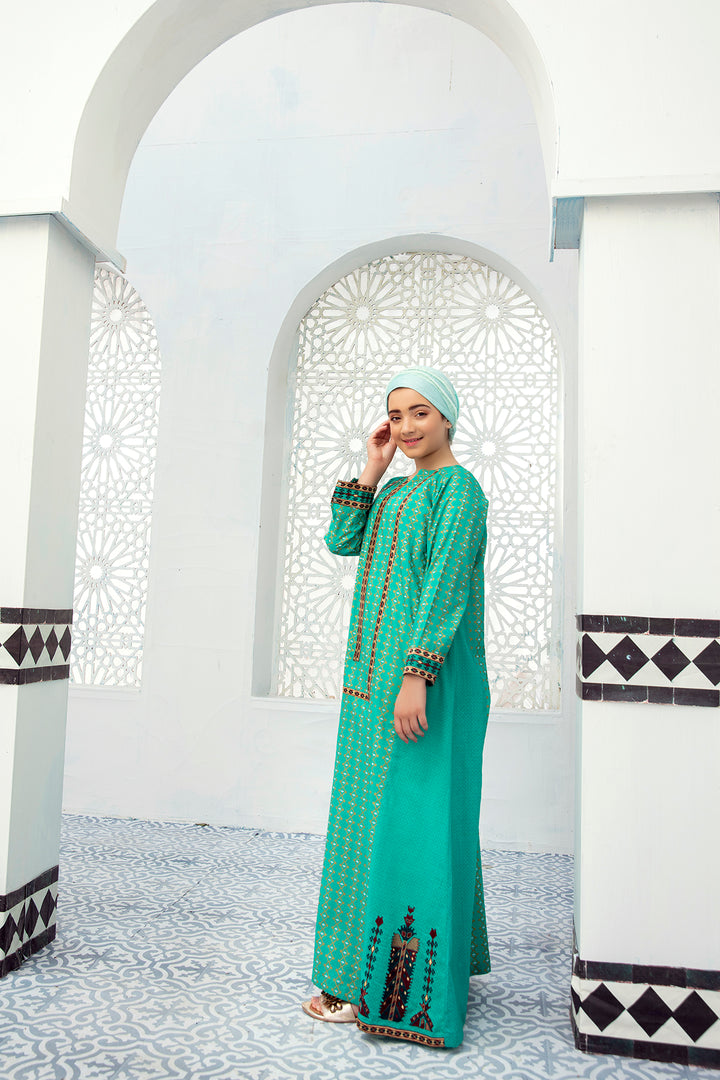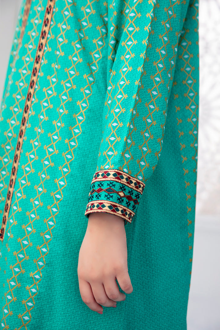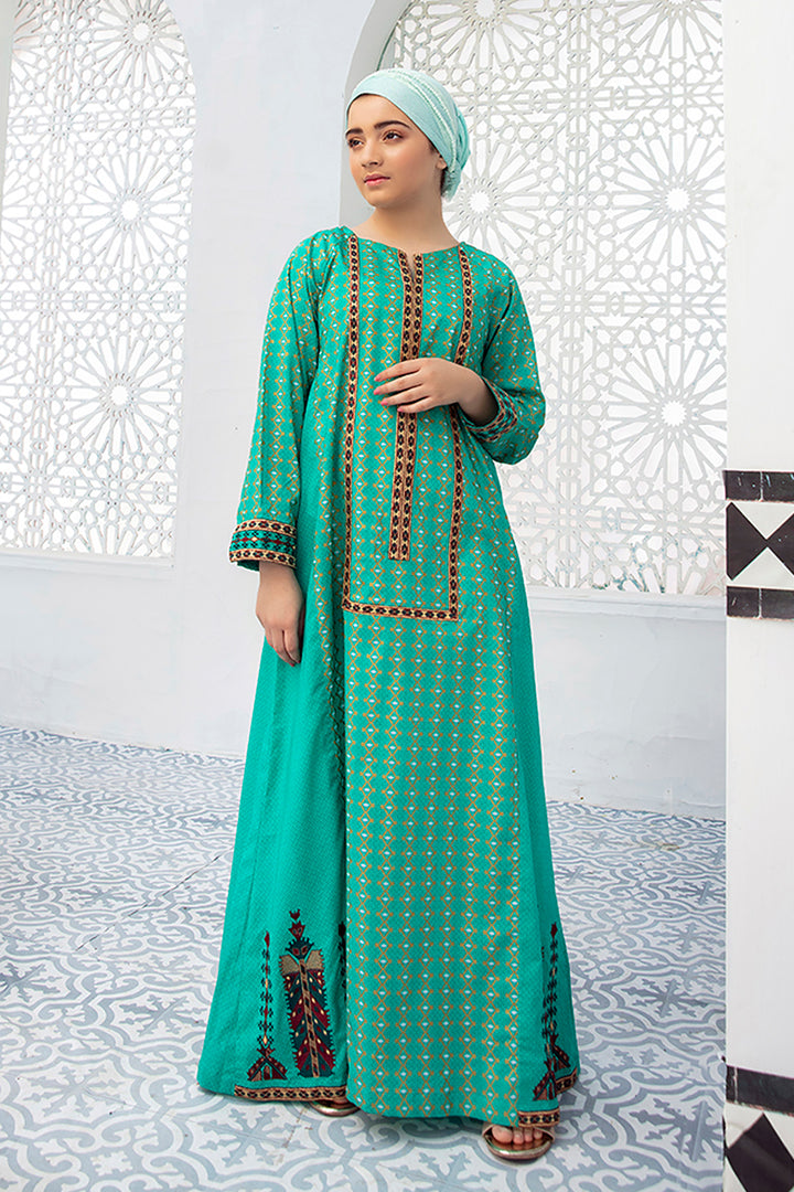 Mix And Match Printed Fustaan With Embroidered Center Front And Embroidered Side Panels, Raglan Sleeves With Embroidered Border From latest kids Fustaan Summer 2021 Eid Ul Fiter Collection by Nishat Linen.