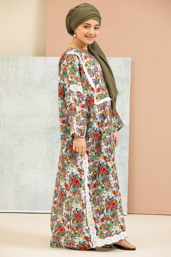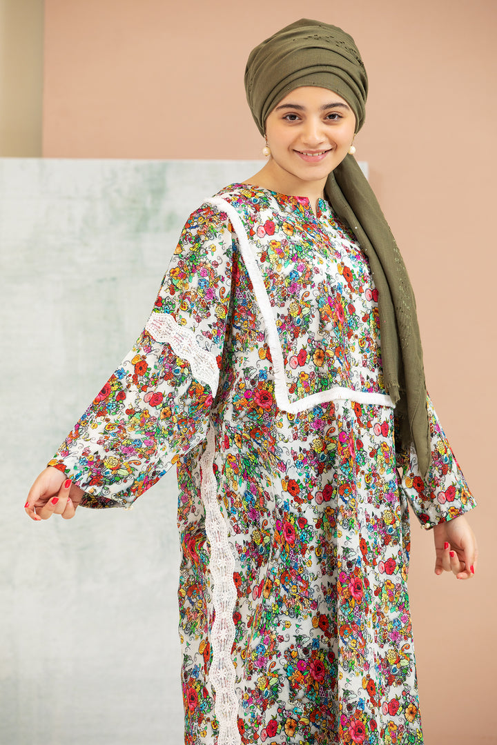 Boxy cut Fustaan with round neck and slit, highlighted with laces on front and neckline From latest kids Fustaan Summer 2021 Dawat-e-Eid Collection by Nishat Linen.