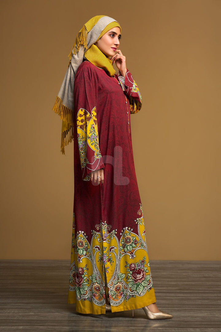 Vibrant red colored printed stitched Fustaan from latest Winter collection 2019 by Nishat Linen to make you look modest yet trendy.