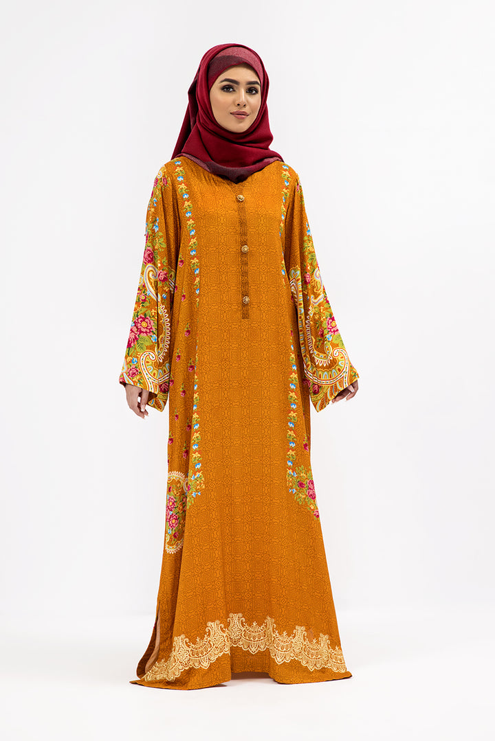 Bright up your day with this refreshing printed embroidered long Fustaan from latest Fustaan winter 2021 collection by Nishat Linen.
