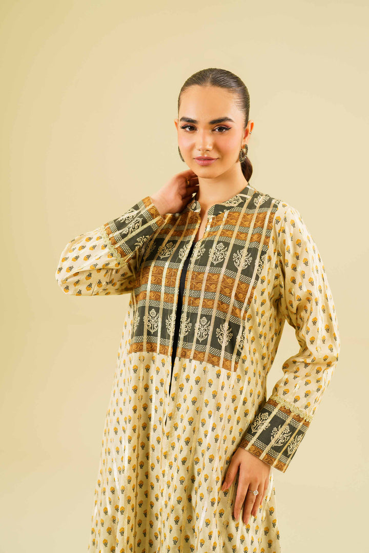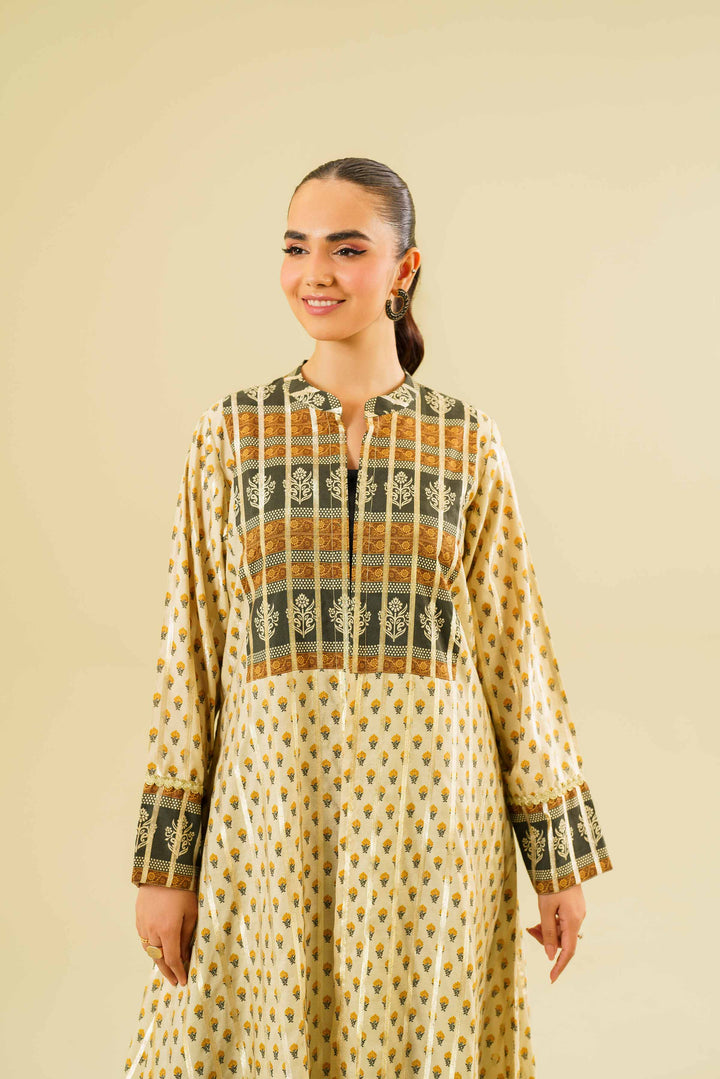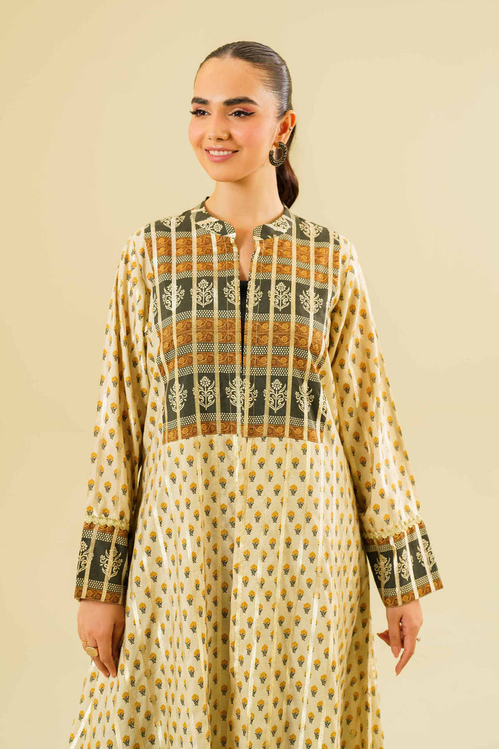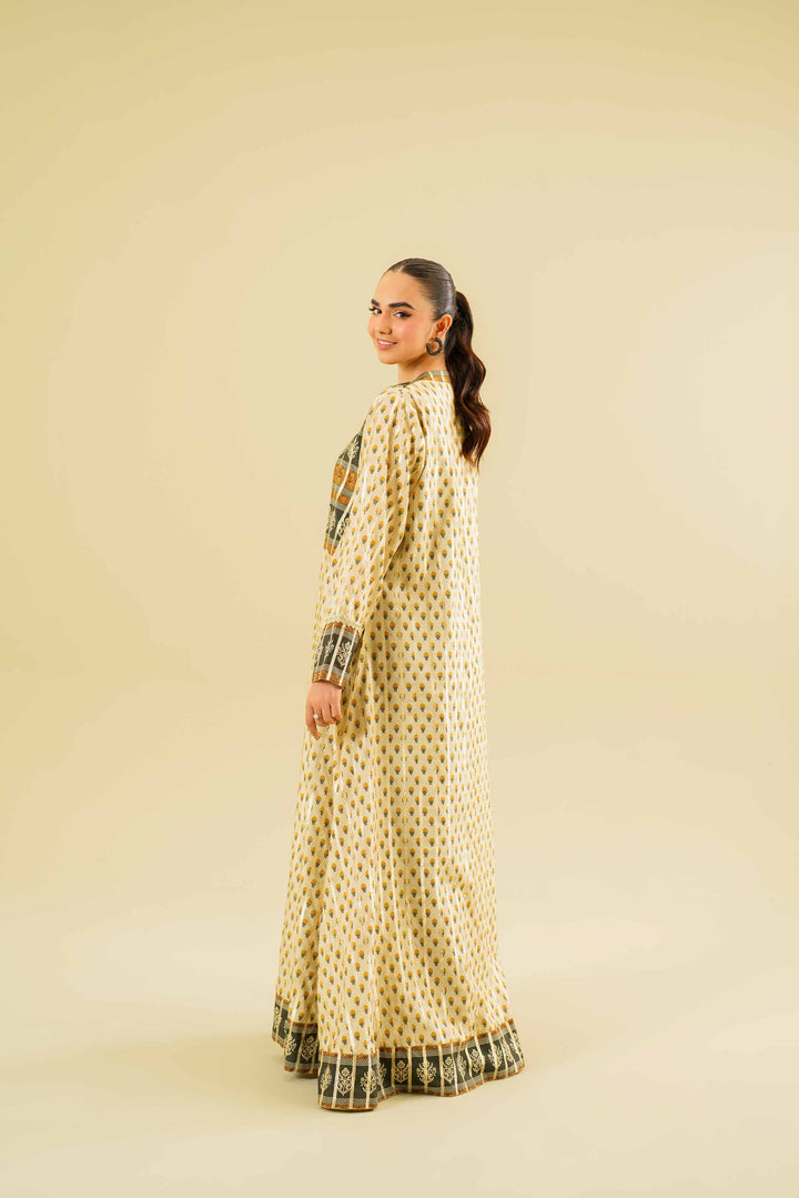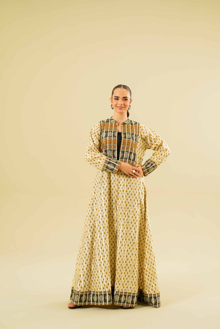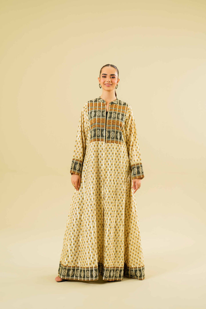 Band Neckline, Border & Lace Detail At Sleeves, Front Panel Detail, Open Gown Fustaan,Designed For A Relaxed Fit