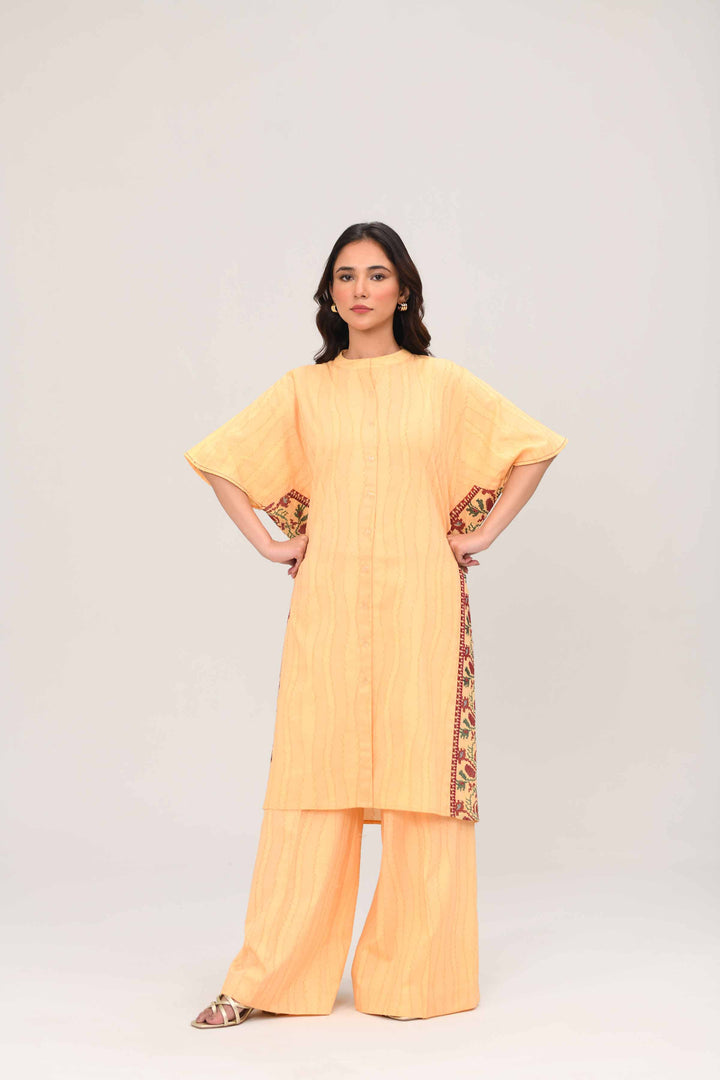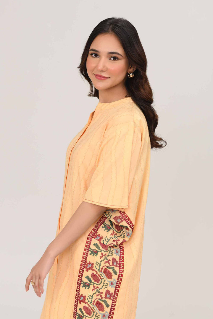 Band Neckline With Placket & Buttons Detail On Front, Embroidered Panels On Sides, Button Down Straight Shirt