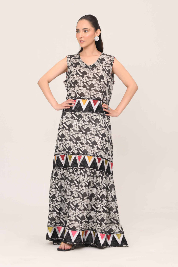 V Neckline, Embroidered Front Panel & Round Hem, Gathered Hem, Sleeveless Long Dress