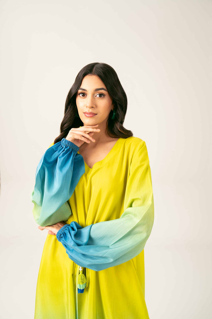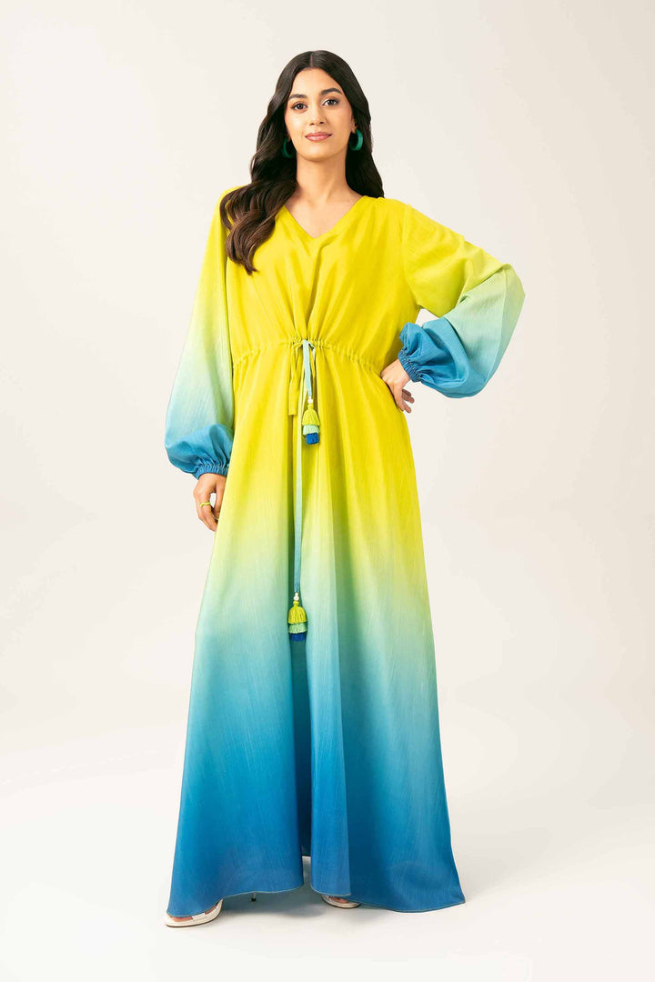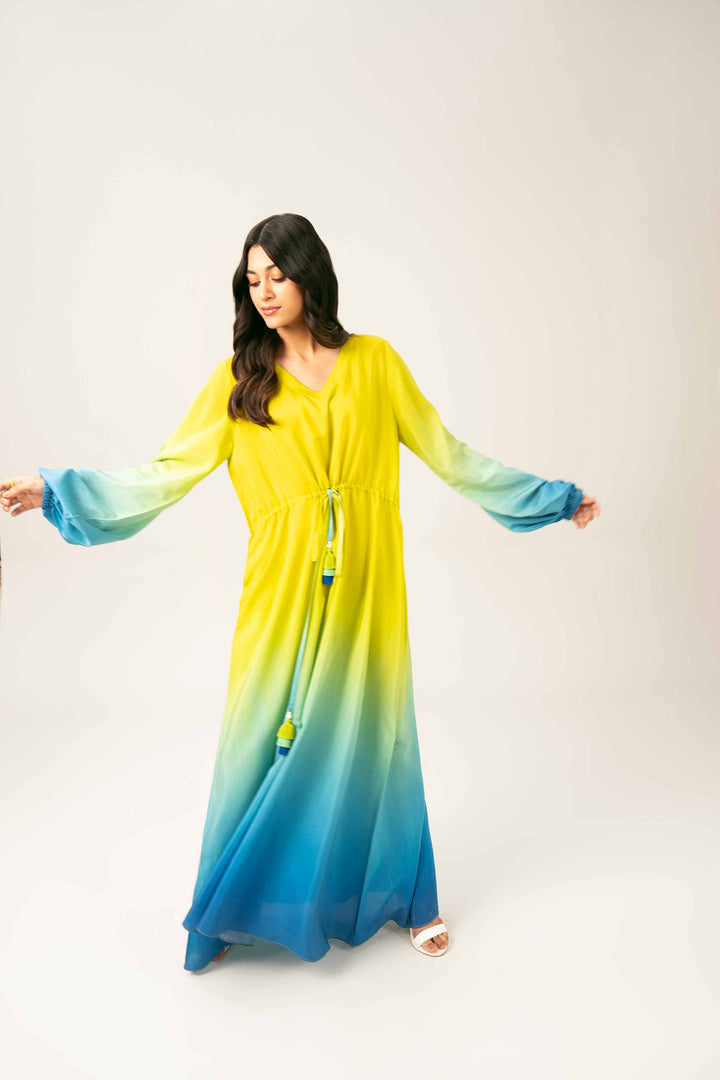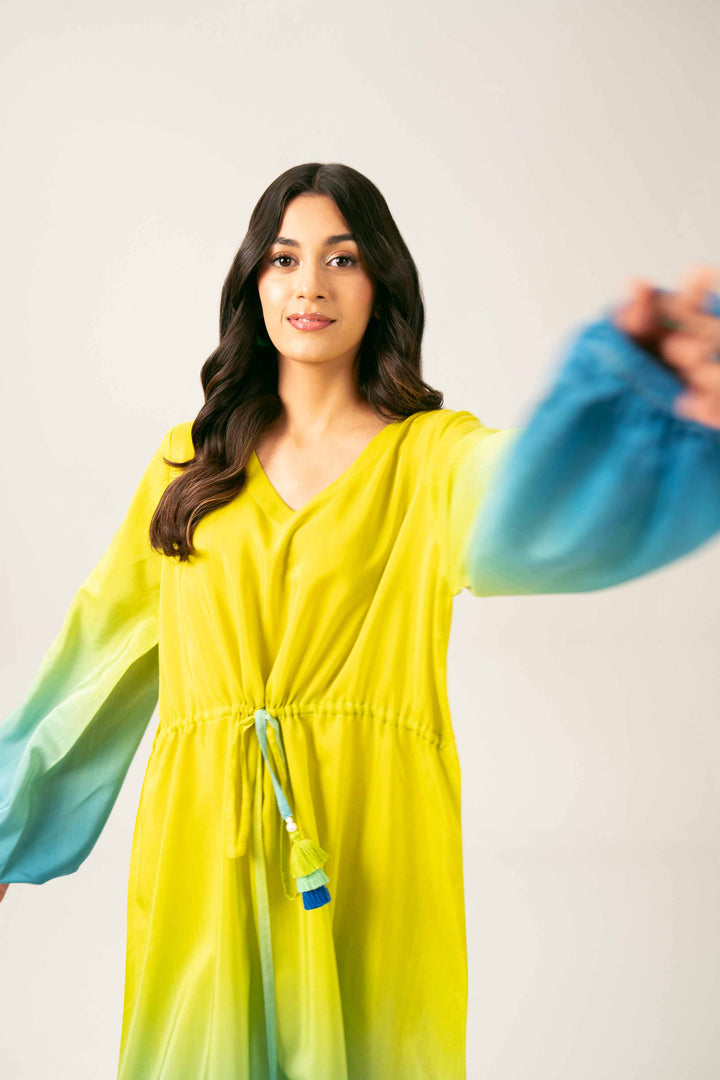 V Neckline, Tied With String And Tassels On Waist, Puff And Gathers On Sleeves, Long Dress