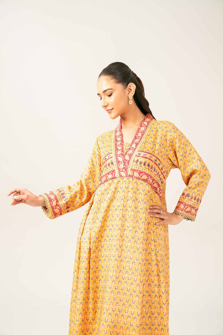 V Band Neckline With Gusset, Lace Detail On Sleeves, Long Dress With Pleats On Front