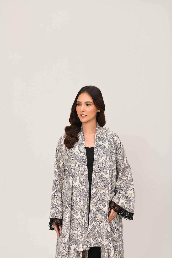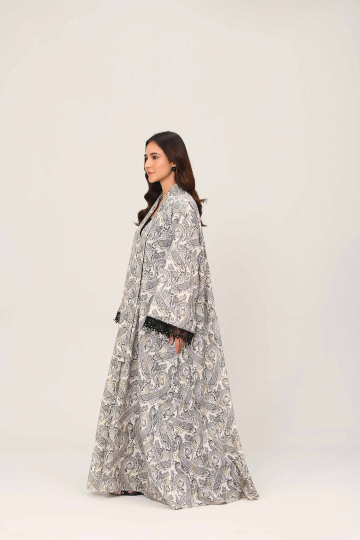 Shawl Collar Neckline, Loose Sleeves With Lace Detail On Edges, Long Front Open Gown
