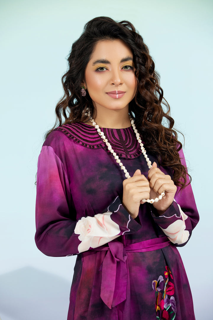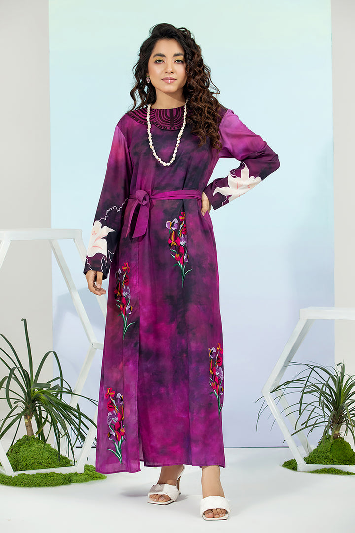 Exemplify your style in this printed long dress with waist-belt and front slit, enhanced with embroidery details on the neckline and embroidered floral motifs on the front from latest fusion Summer 2021 collection by Nishat Linen.