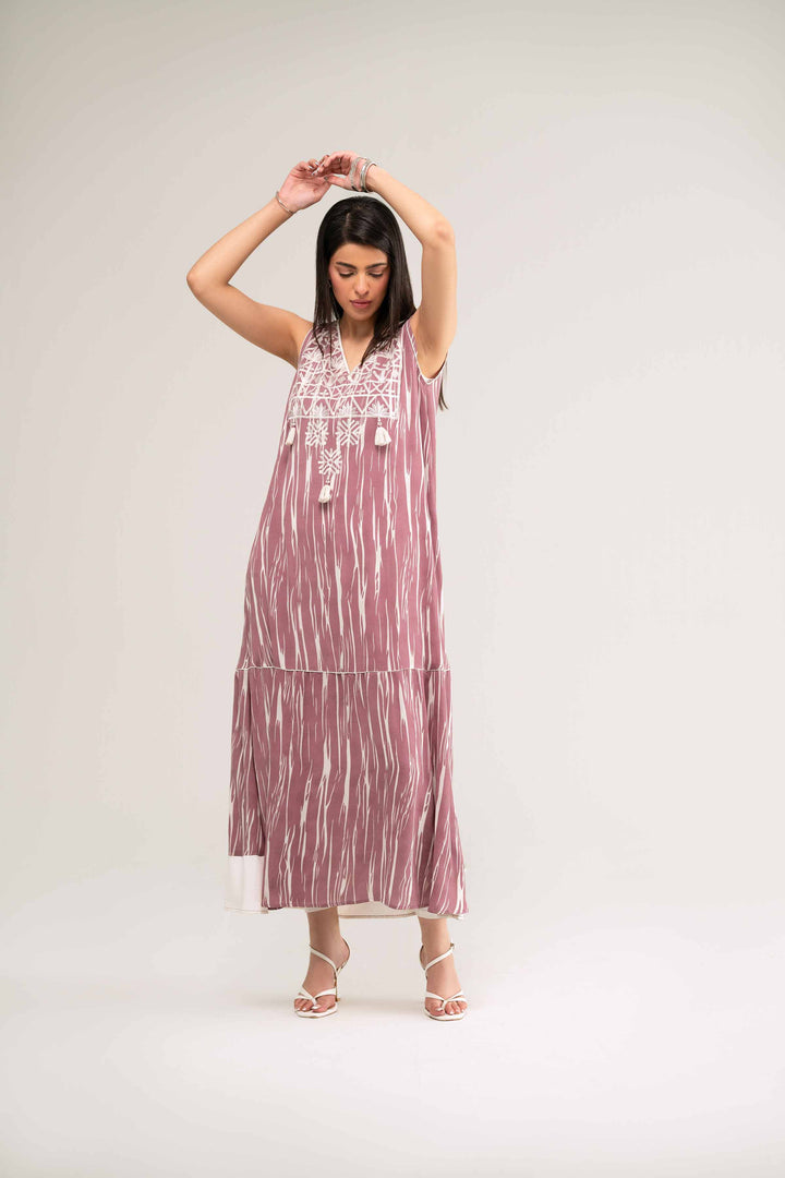 V Neckline, Embroidered Neckline With Tassels Hanging Detail On It, Piping & Color Block Border On Back, Sleeveless Long Dress