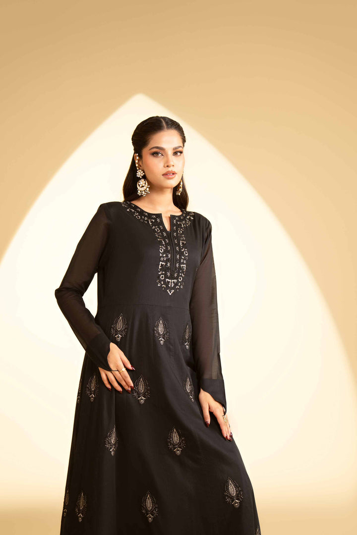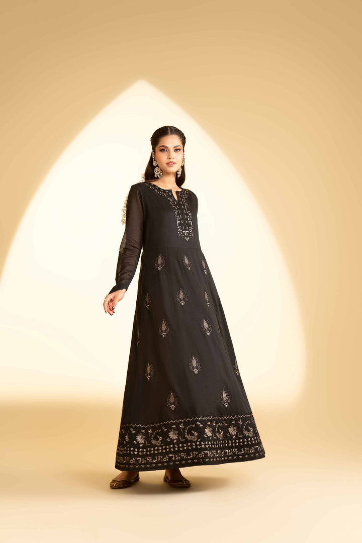 Round Neck With Piping, Slim Fit Stylized Sleeves, Extended Embroidered Border At Hem, Long Embroidered Paneled Dress