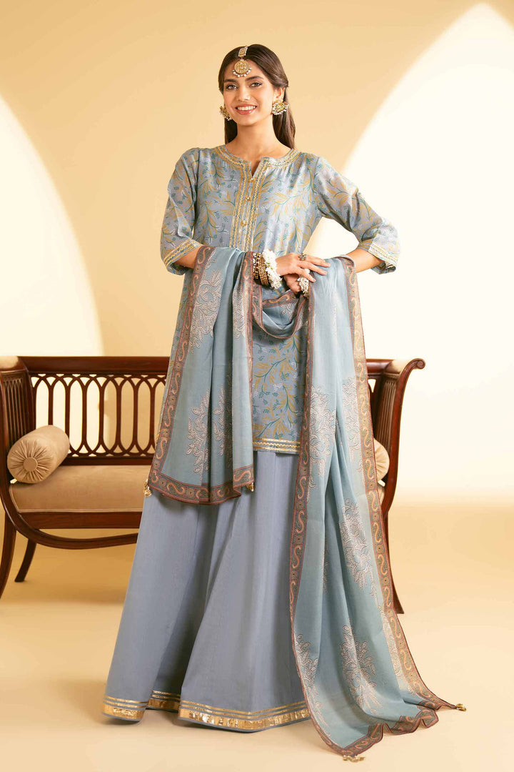 Make your look fabulous by wearing this printed embroidered three-piece suit from the latest luxury pret summer collection.