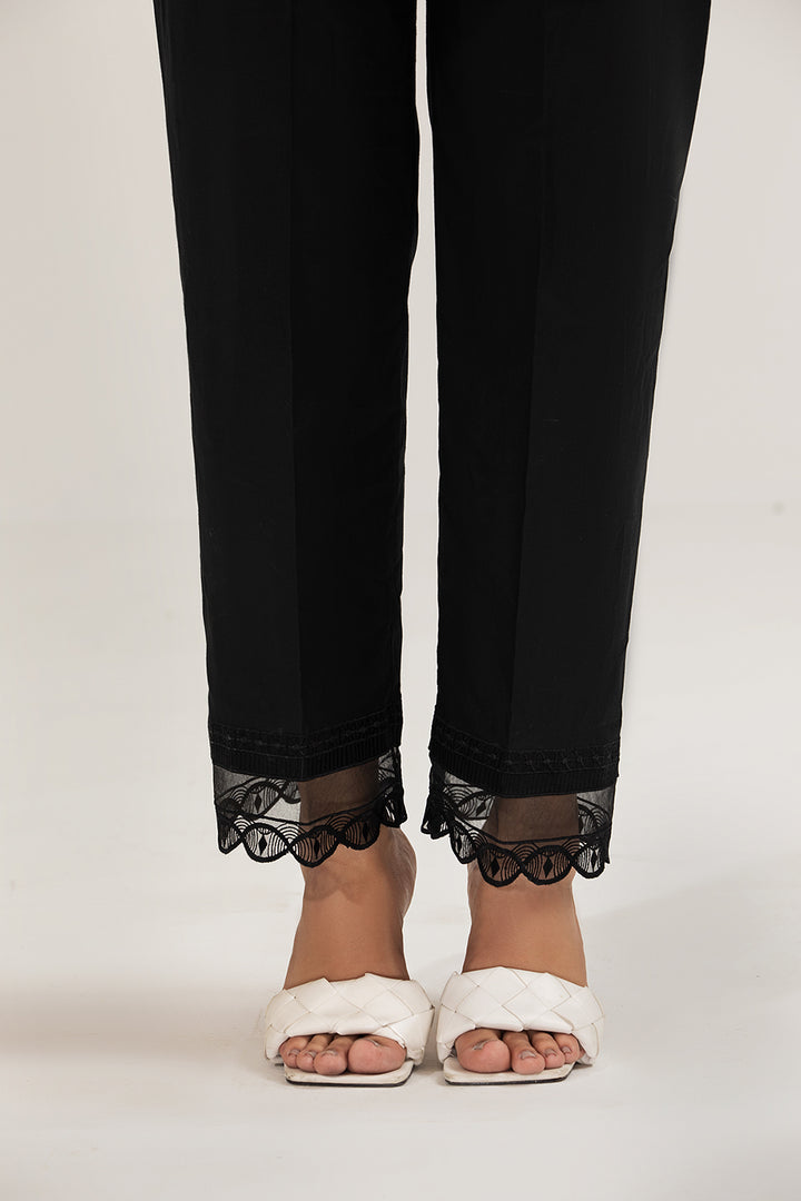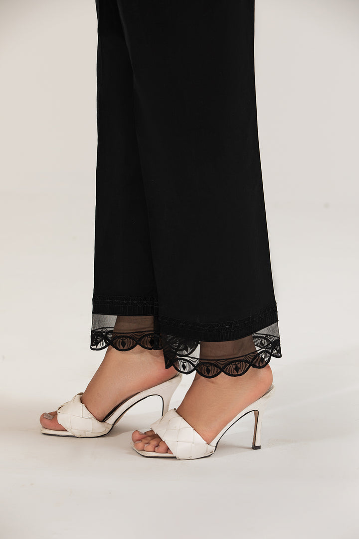Black cambric stitched straight trouser with embroidered organza and scallop detailing for women from latest Summer 2021 Eid Ul Fiter collection by Nishat Linen to pair with any dress.