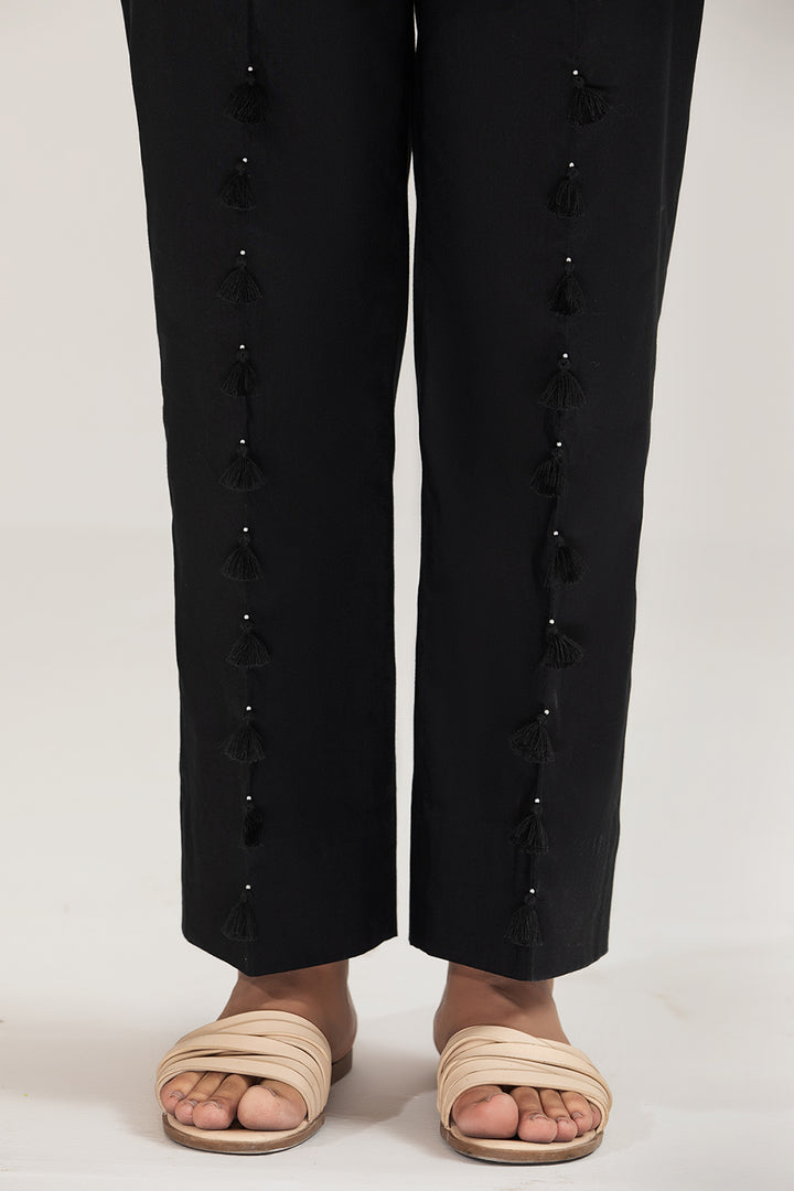 Black cambric stitched loose straight trouser with tassel detailing for women from latest Summer 2021 Eid Ul Fiter collection by Nishat Linen to pair with any dress.