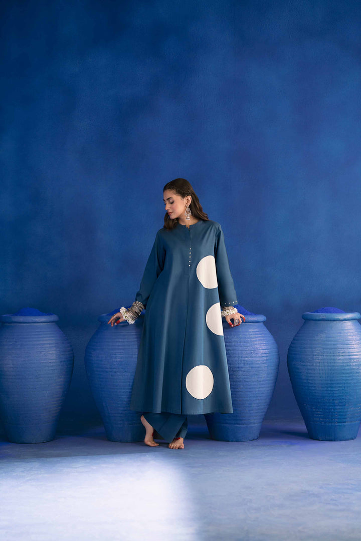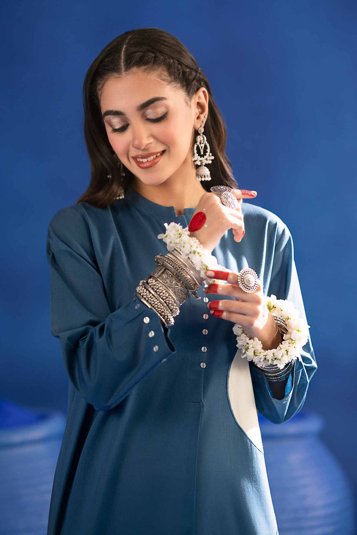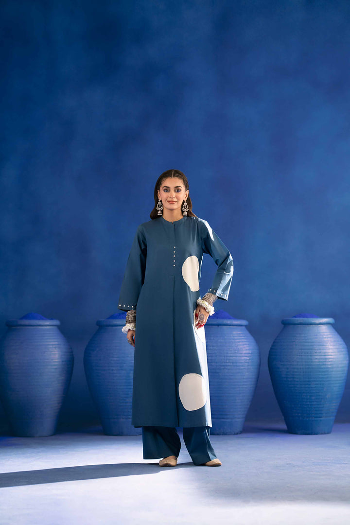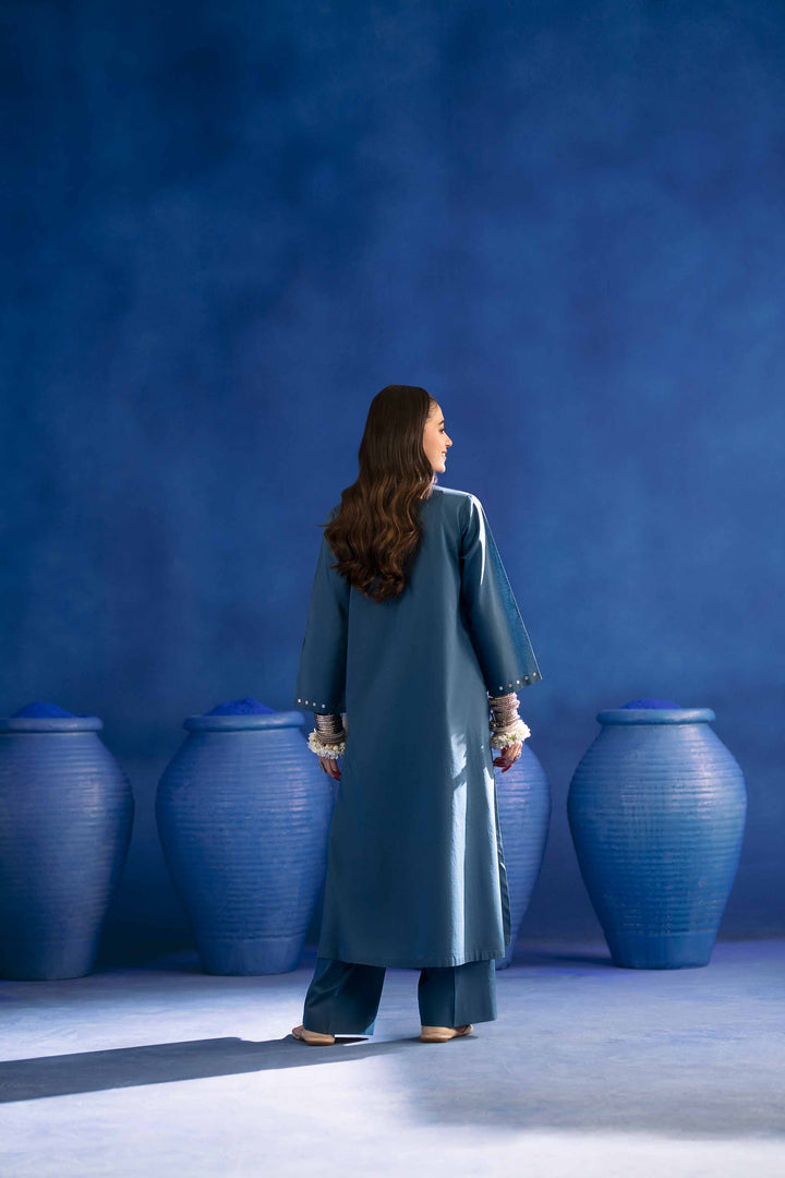 Band Neckline With Placket, Knife Pleat Detail On Placket, Sequence Detail On Placket & Sleeves Edges, Long Flared Shirt