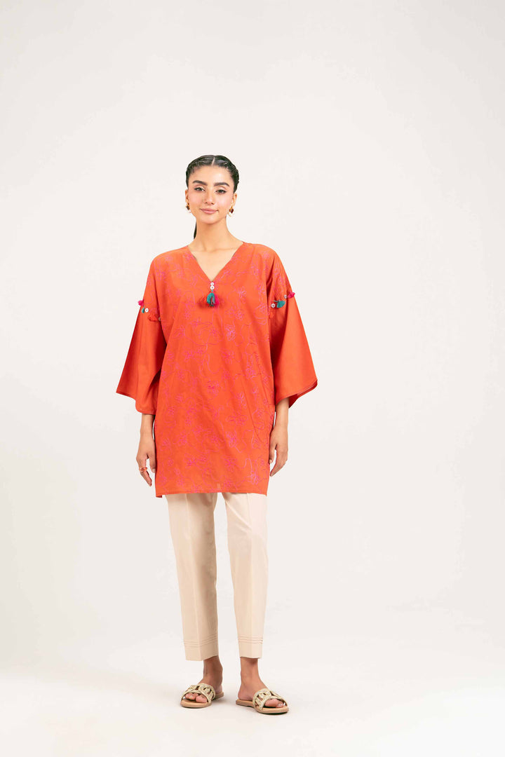 V Neckline, Tassel Detail At Neckline & Sleeves, Embroidered Boxy Tunic