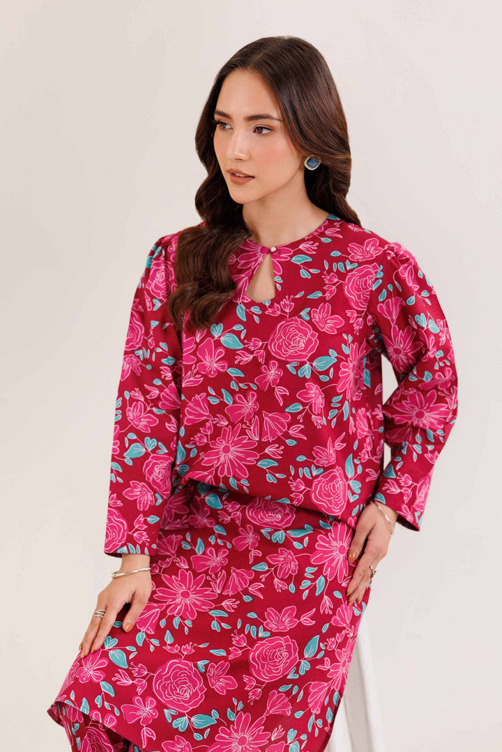 Round Neckline With Keyhole, Gathers Detail On Sleeves, Round Hem Printed Shirt