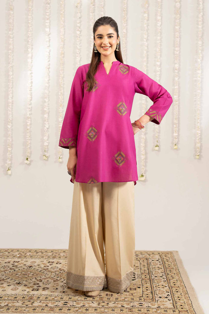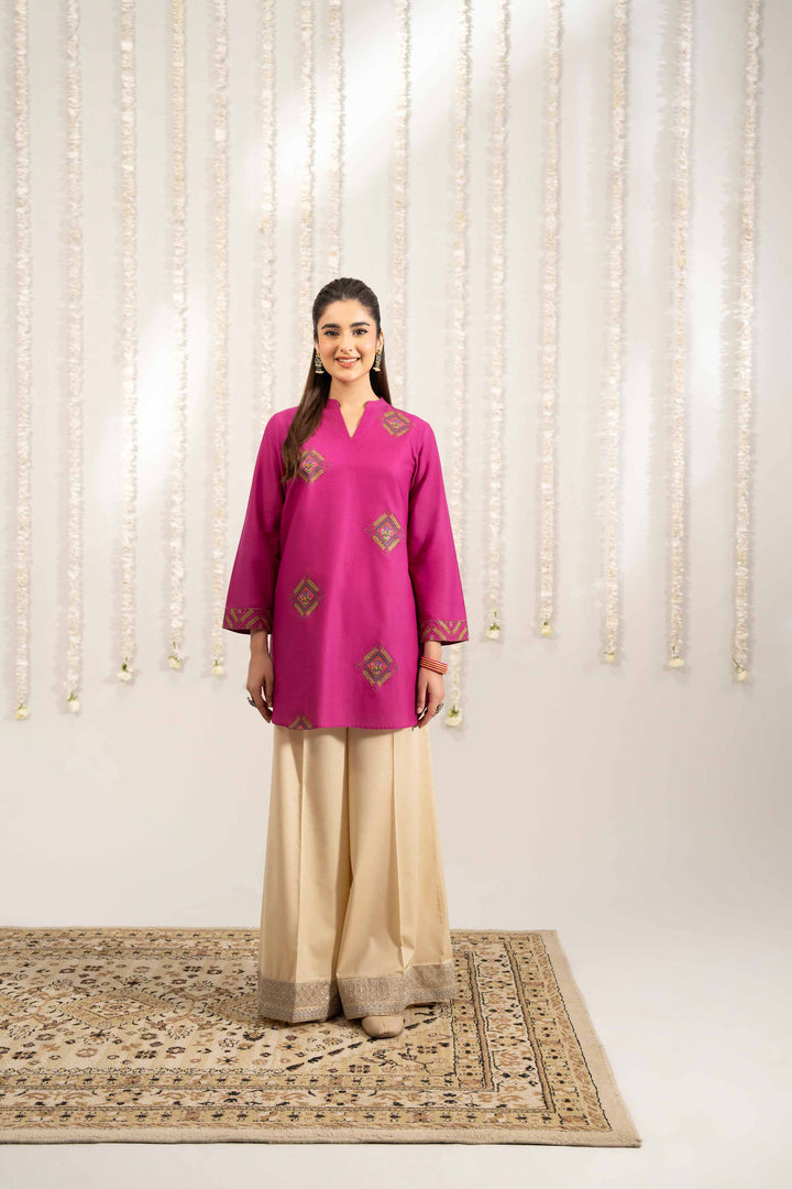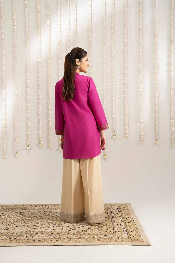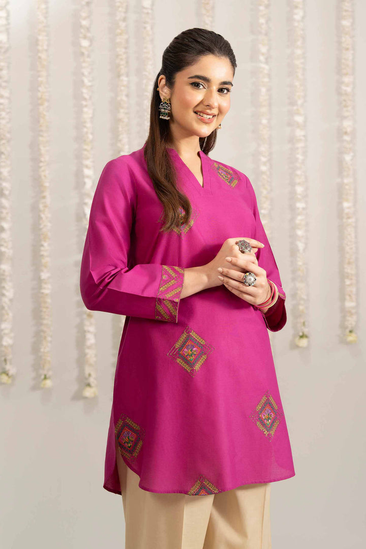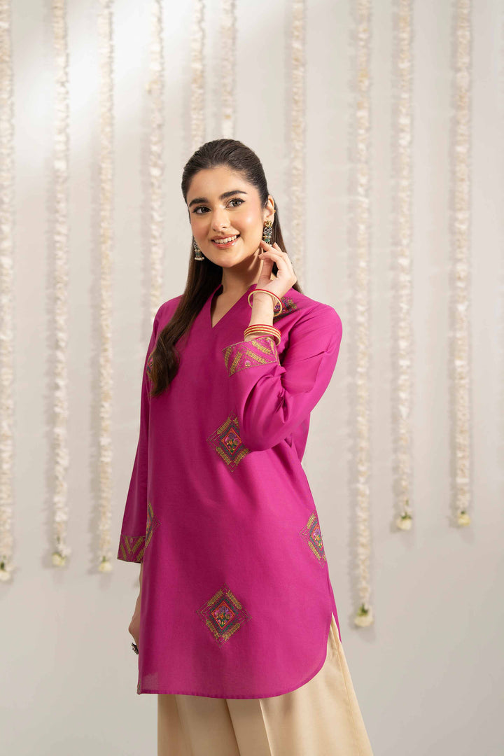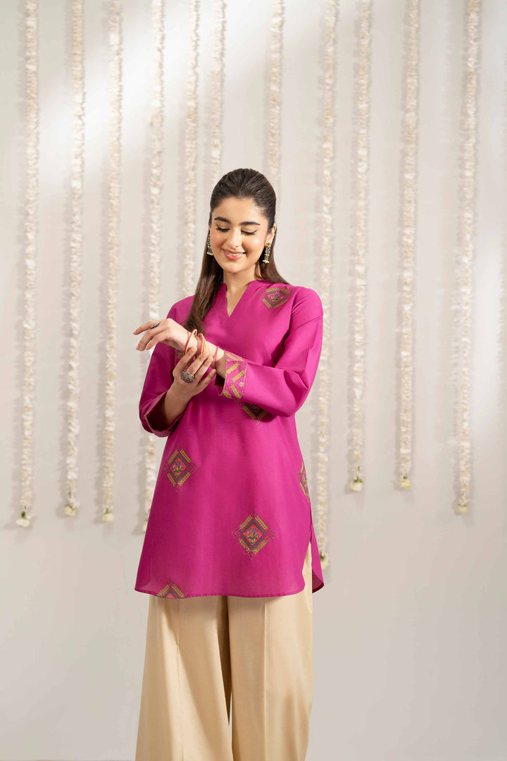 Shirt featuring a band neckline with V slit, and intricate embroidery on the front and sleeves for an elegant and stylish look.