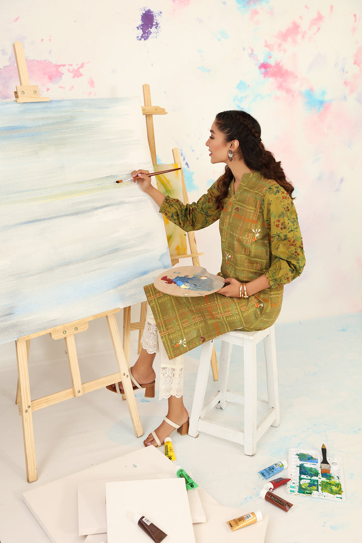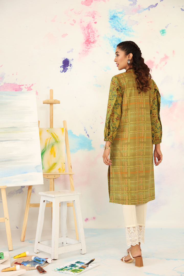 Exemplify your style with this printed cambric shirt with waist cutline and overlapped sleeves adorned with bead detailing from latest ready to wear Summer 2021 Dawat-e-Eid Collection by Nishat Linen.