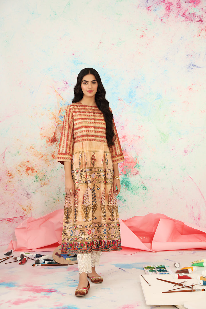 Be special in this unique printed lawn shirt with yoke and inverted box pleats, finished with embroidered border extension on the hemline from latest ready to wear Summer 2021 Dawat-e-Eid Collection by Nishat Linen.