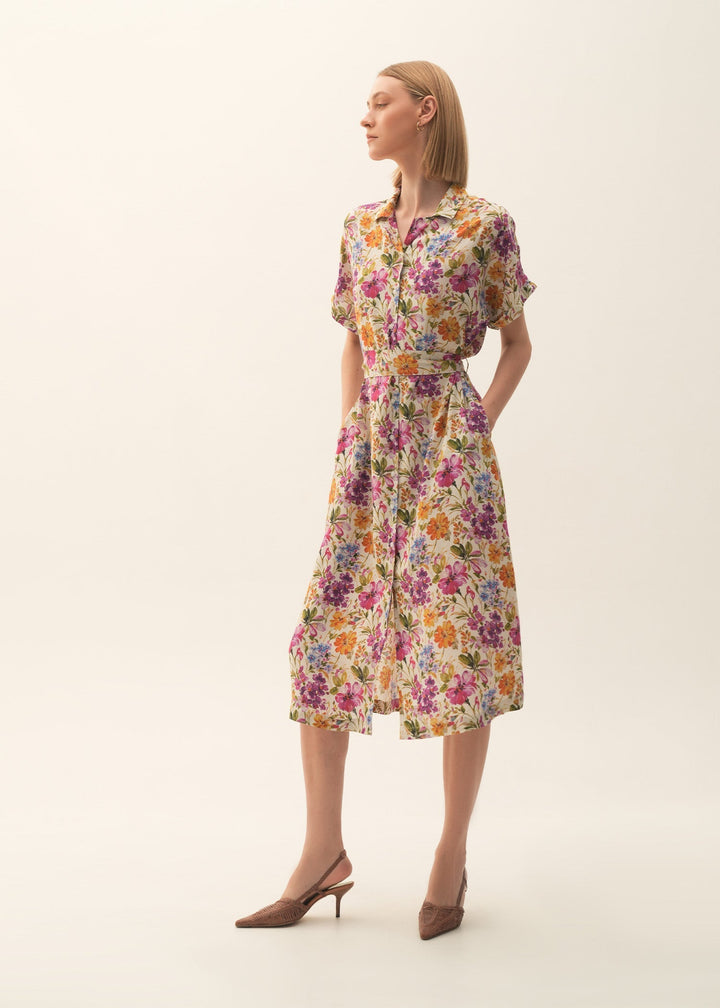 Product Description: Floral, printed, flared dress with notched lapel collar and short sleeves. Includes a belt
