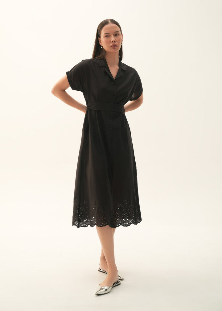 Product Description: Flared cotton dress with Schiffli Embroidery on hem, button-through opening, notched lapel collar and short sleeves. Includes a belt