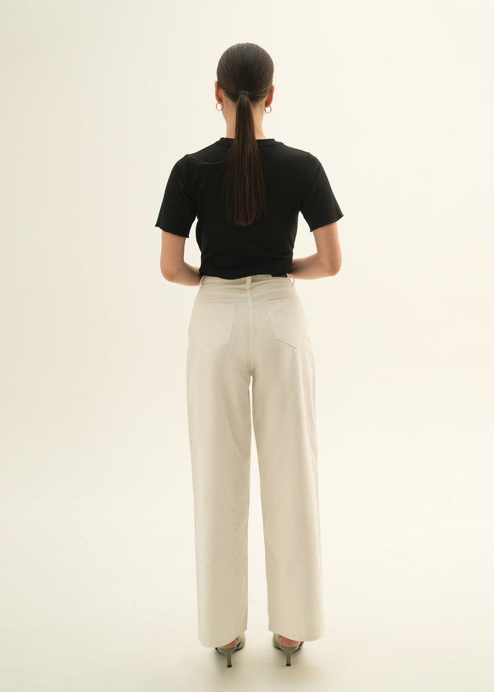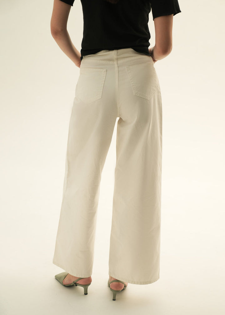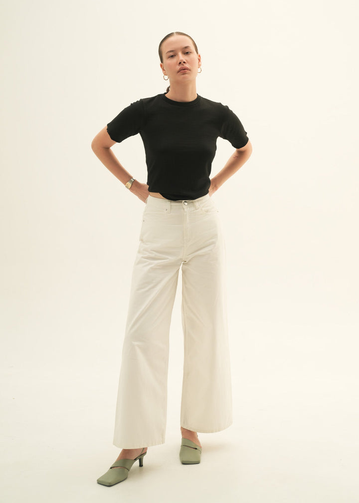 Product Description: High-waisted, cropped, wide-leg cotton denim with raw hem edge. Belt Loops and basic 5 pocket design. Zip fly and metal button fastening.